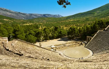 C’est dans le cadre verdoyant d’une vallée du Péloponnèse que vous découvrez ce sanctuaire antique. Dédié au dieu de la médecine Asclépios, ce gigantesque amphithéâtre accueillait des pèlerins venus se convertir au culte thérapeutique. Considéré comme l’un des chefs-d’œuvre de l’architecture antique, ce monument ne laisse jamais indifférent. Preuve en est l’impressionnant panorama qu’on observe depuis les dernières marches du théâtre.