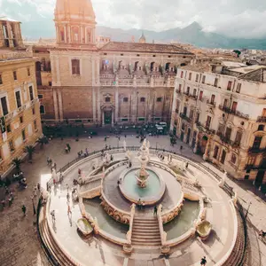 Commandée par Francesco Bonanno, un aristocrate de Palerme, en 1554, la Fontana Pretoria est une fontaine baroque impressionnante, ornée de statues et de sculptures représentant des personnages mythologiques, des animaux et des motifs floraux. Elle est composée de trois bassins, chacun décoré de sculptures de marbre blanc, qui s’élèvent en hauteur et en largeur, créant une impression de grandeur et de majesté. La fontaine mesure environ 20 mètres de large et 9 mètres de haut, et est entourée de bâtiments anciens qui lui donnent une atmosphère pittoresque.